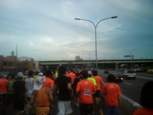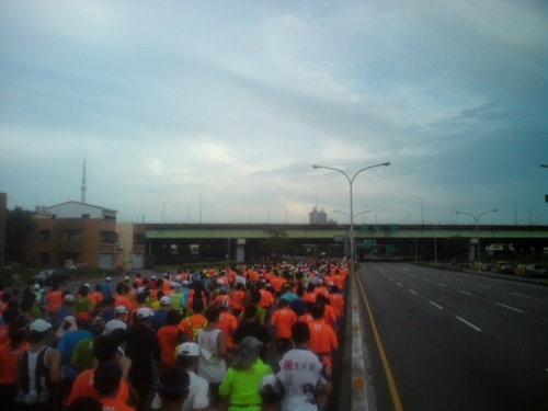 因為是國際邀請賽,聲勢頗為浩大,國外參加之友人頗眾,全馬報名限3000人、半馬者限6000人,清晨六點9000人同時鳴槍起跑出發,對我而言是有很大之影響(可能也是牽拖),整整第一段路程10公里,也是半馬折返點之前的路程一直都是擁擠不堪的,所以這一段里程我相信是影響了我的配速的,直到感覺人稍微稀鬆時出現11公里的標示牌,時間已經用去90分鐘,這個路段的配速很明顯會是失敗的因素,依據自己對自己的了解,很慚愧後段班應該蜘蛛必較。