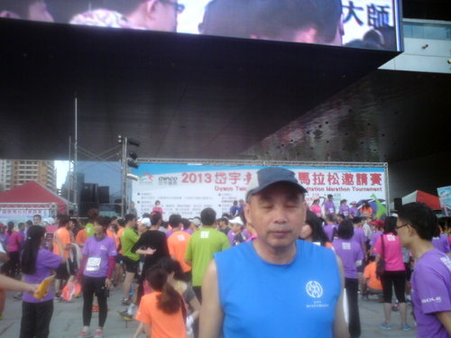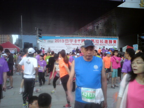 6/16是日清晨五點不到,騎機車沿著平日晨跑的路線旱溪往台中出發,到達台中市府旁愛買停好機車,已是人聲鼎沸,時間才五點二十五分,寶民從嘉義出發,他們單位主管似乎極力支持岱宇的活動,派出兩部交通車,分乘一邊是參加半馬者,另一部則參加全馬者。共有四十多人前來,而且老將如雲,全馬不泛三小時左右的高手,還一直鼓勵我說寶箴也是高手,可以和他們一較高低,跑完寶箴真是汗顏。