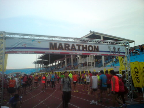 對我而言的確是事實。今日大約跑到24公里就已經感覺撞牆,大腿小腿都變僵硬,而且膝蓋也特別痛,此後都只能是靠著意志力一路硬撐,雖然艱苦,每每救護車一直跟在旁邊,還有幾次回收車一直勸告,時間將會不夠,寶箴從無動念放棄。