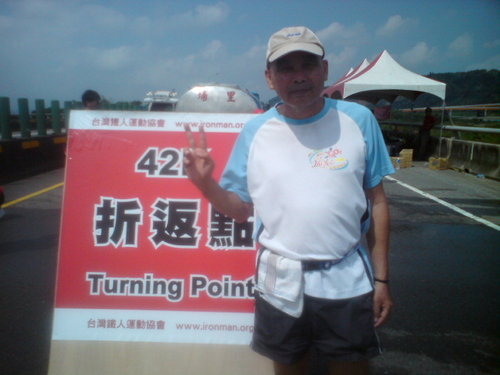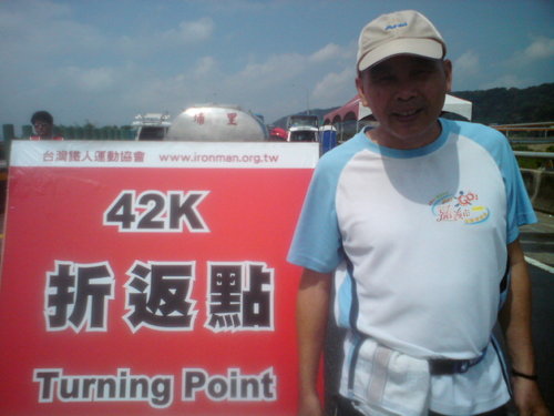 張朝欽兄說他有報名這一場,我卻一直追不到他,到了21公里處全馬的折返點,見到了經常碰到的寶鳳姐,此時看時間我已用了3小時又十分,顯然今日是落後往日許多。